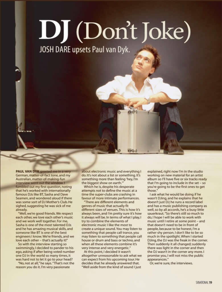 JOSH DARE upsets Paul van Dyk.Interviews with DJs are usually just the interviewer going through the motions of an actual, proper, interesting interview. I suppose it’s a testament to their professions that they don’t have anything original to offer and just regurgitate bland dialogue in the guise of party-talk. You ask all the right questions; the ones they want to hear like, ‘What’s the most satisfying thing about your job?’, and the answer usually some lame variant of ‘Seeing so many people peaking to my music at the same time’. You let ‘em wax lyrical about ‘choonz’, sometimes you’ll get a sound bite or snippet of something original, but mostly it’s just bullshit.So when the job of interviewing the world’s number one DJ arose, I had to wonder whether the ranking included press savvies. With Paul van Dyk’s German office phone number in hand (along with my allocated timeframe, 8:45pm-9pm), I made the call. He greeted me in a very German matter-of-fact tone. Exactly the opposite to what I was going for with my questions.For example, my opener: I note that, according to his bio, he’s worked with all the internationally famous DJs like BT, Sasha and Dave Seamen, so there must be some sort of out DJ mother’s club equivalent going on. In a sigh that kind of suggested he was sick of me already, he replied, “Well, we’re good friends really. We respect each other, we love each other’s music and we work well together. For me, Sasha is one of the most talented DJs and he has amazing musical skills, and someone like Brian [BT] is one of the best engineers I know. We’re friends, and we love each other – that’s actually it!”Uh oh – better chuck a ‘right’ question in. After being voted number 1 DJ in the world so many times, it must be hard to not let it go to your head? “No, not at all – because this is not the reason you do it. I’m very passionate about electronic music and everything I do. It’s not about a list or something. It’s something more than feeling ‘hey, I’m the biggest show on earth’.”Back to my original questions – the biggest show on earth must surely have so many groupies by now, I suggest. If he weren’t on hands free, I’m sure he would’ve dropped the phone before he flustered, “I see a few familiar faces in different places. I wouldn’t say I have anything to do with traditional groupies because they know I’m married and off that market.” – emphasising the word married, like a knife flung at me down the phone line. “I have some real loyal fans that travel to a lot of different places. There’s two guys, I believe they’re from Egypt, and I’ve seen them virtually all over the world – except for Australia!”Which opens the door to discussions of Australia. He lets me know he’s always had absolute amazing experiences here, as we actually enjoy electronic music and educated about what’s really going on because so many DJs tour here. It’s a good yarn, except I bugger that up too by trying to invoke a bit of the old Australian rivalry by asking if he’s noticed any differences in clubbing styles in the capital cities. He clearly sees straight through my ploy and explains, “I have to say when I’m in Australia I have quite a hectic schedule so I’m not getting too much of local politics.”I then ask about the fall of the super club, which in German apparently translates to ‘give me a lecture on what electronic music is to you’. “Well the thing is, I don’t label the music; for me it’s all electronic music and there’s different elements and genres of that that actually fit different sizes of venues. This is how it’s always been, and I’m pretty sure it’s how it always will be. In terms of what I play, I try to combine the best elements I like the most of electronic music to create a unique sound. You may listen to something that people call trance, you may listen to something that people call house or drum and bass or techno, and when all these elements combine it’s very intense and very energetic.”At this point, I decided it’s not altogether unreasonable to ask what we can expect from his upcoming tour. But he decides that he already answered that. “Well aside from the kind of sound I just explained, right now I’m in the studio working on new material for an artist album so I’ll have five or six tracks ready that I’m going to include in the set – so you’re going to be the first ones to get those.”The ever-present clock staring down at me, I ask my final, timely question: what would he be doing if he wasn’t DJing? He explains that he doesn’t just DJ; he runs a record label and has a music publishing company as well. Not only that, there’s an online radio station and download shop at “dub dub dub vonyc dot com, that’s V-O-N-Y-C”, so by all accords, he’s a busy little sauerkraut. “So there’s still so much to do, I hope I will be able to work with music until I retire at some point – and that doesn’t need to be in front of people, because to be honest, I’m rather shy person. I don’t like to be so much in the spotlight. When I started DJing, the DJ was the freak in the corner. Then suddenly it all changed; suddenly there was light in the corner and then the DJ wasn’t in the corner any more. I promise you, I will not miss the public appearances.”Time’s up, the tape recorder flicks off, and I try to have one last joke with him – does the reference to ‘public appearances’ include interviews? He doesn’t get my little stab at myself, and goes on to say that interviews are great way to get his message across, spreading his word about charity and goodwill.I just hope he kept that in mind for his next interview.