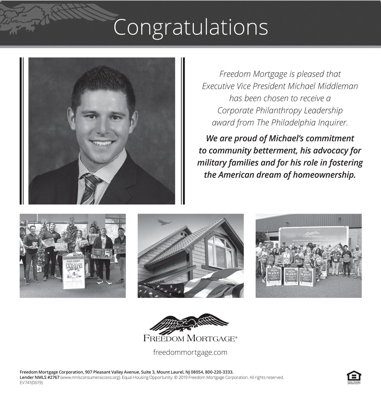 Freedom Mortgage is pleased that Executive Vice President Michael Middleman has been chosen to receive a Corporate Philanthropy Leadership award from the Philadelphia Inquirer.