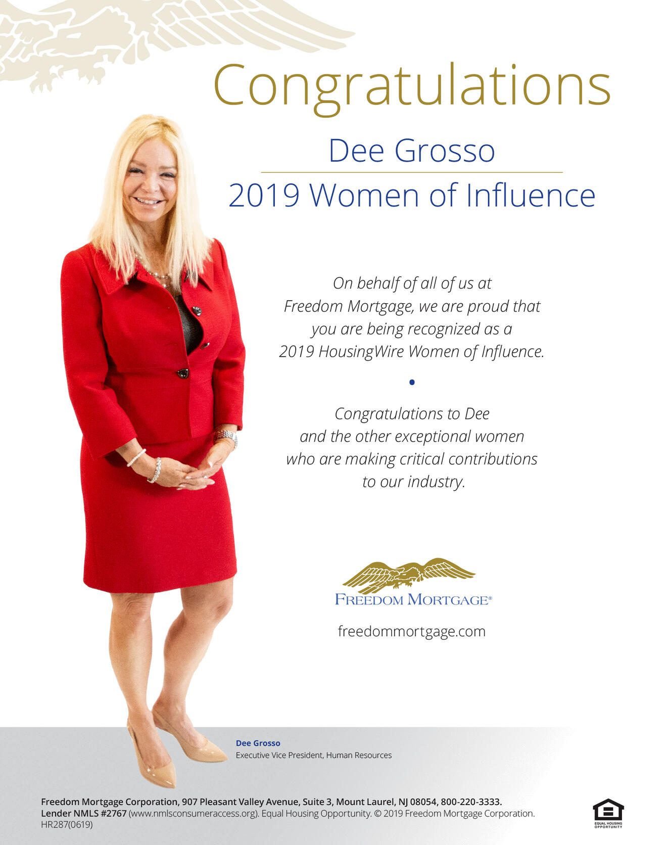 2019 Women of InfluenceOn behalf of all of us at Freedom Mortgage, we are proud that you are being recognized as a 2019 Housing Wire Women of Influence.Congratulations to Dee and the other exceptional women who are making critical contributions to our industry.