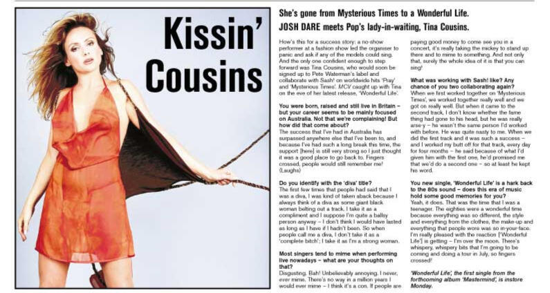 JOSH DARE meets pop's lady-in-waiting, Tina CousinsHow’s this for a success story: a no-show performer at a fashion show led the organiser to panic and ask if any of the models could sing. And the only one confident enough to step forward – Tina Cousins, who would soon be signed up to Pete Waterman’s label and collaborate with Sash! on worldwide hits ‘Pray’ and ‘Mysterious Times’. We caught up with Tina on the eve of her latest release, ‘Wonderful Life’.You were born, raised and still live in Britain – but your career seems to be mainly focused on Australia. Not that we’re complaining! But how did that come about?