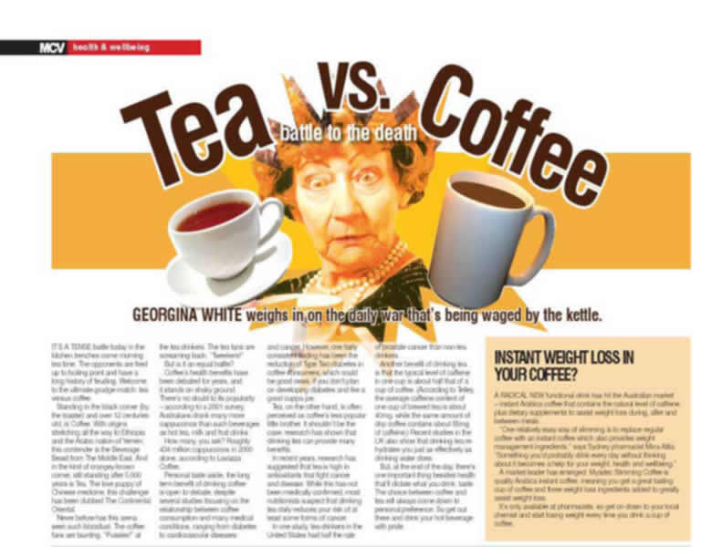 JOSH DARE (under pseudonym Georgina White) weighs in on the daily war that’s being waged by the kettle.It’s a tense battle here today in the trenches of the kitchen come morning tea time. The opponents are fired up to boiling point and have long history of feuding. Welcome to the ultimate grudge match: tea versus coffee.Standing in the black corner (by the toaster), over 12 centuries old is Coffee. With origins stretching all the way to Ethiopia and Europe, this contender is the Beverage Beast from The Middle East. And in the kind of orangey-brown corner, still standing after 5,000 years is Tea. The love puppy of Chinese medicine, this challenger has been dubbed The Continental Oriental.Never before has this arena seen such bloodlust. The coffee fans are taunting, “Pussies!” at the tea drinkers. The tea fans are screaming back, “Tweakers!”. But is it an equal battle?Coffee’s health benefits have been debated and it stands on shaky ground. There’s no doubt to its popularity – according to a 2001 survey, Australians drank more cappuccinos than hot tea, milk or fruit drinks. How many, you ask? Roughly 434 million cappuccinos in 2000 alone, according to Lavazza Coffee. But personal taste aside, the long term benefit of drinking coffee is open to debate, despite several studies focusing on the relationship between coffee consumption and many medical conditions, ranging from diabetes to cardiovascular disease to cancer. However, one fairly consistent finding has been the reduction of type 2 diabetes in coffee consumers. Which could be good news, if you’re anti-type 2 diabetes and like a good cuppa joe.Tea, on the other hand, is often perceived as coffee’s less popular little brother. It shouldn’t be the case though: research has shown that drinking tea can provide many benefits. In recent years, research has suggested that tea is high in antioxidants which fight cancer and disease. While this has not been medically confirmed, most nutritionists suspect that drinking tea daily reduces your risk of at least some forms of cancer. In one study, tea drinkers in the United States had half the risk of prostate cancer. Also, the typical level of caffeine in a cup of tea is about half that of coffee. (According to Tetley, the average caffeine content of one cup of brewed tea is about 40mg, whilst the same amount of drip coffee contains about 85mg.) Recent studies in the UK also show that drinking rehydrates just as effectively as drinking water does.But, at the end of the day, there’s one important thing besides health that’ll dictate what you drink: taste. The choice between coffee and tea willo all come down to personal preference. So just get out there and wear your hot beverage with pride.Box out