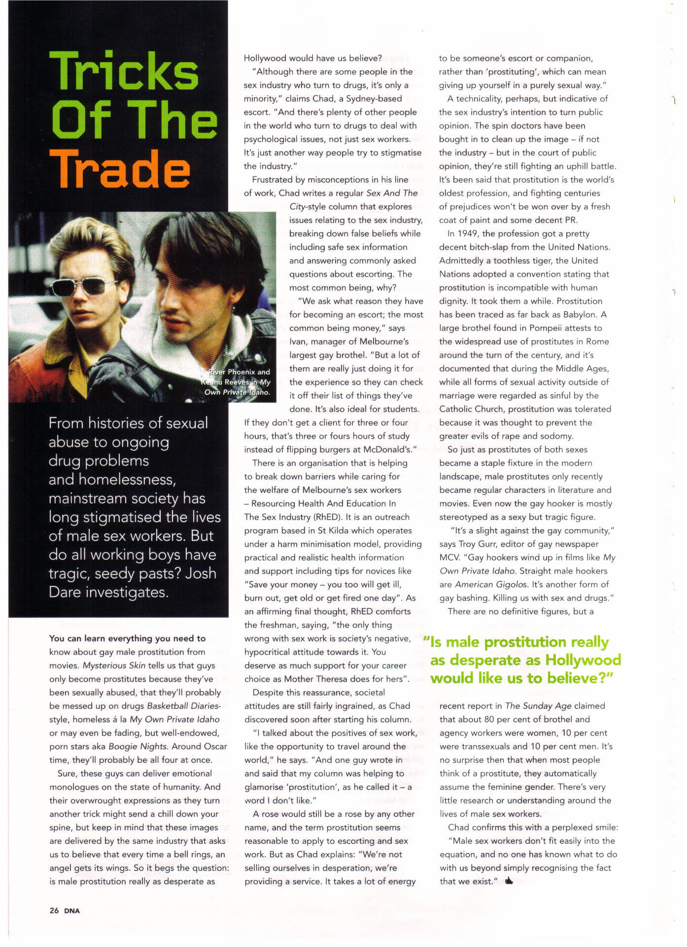 From histories of sexual abuse to ongoing drug problems and homelessness, mainstream society has long stigmatised the lives of male sex workers. But do all working boys have tragic, seedy pasts? JOSH DARE investigates.You can learn everything you need to know about gay male prostitution from movies. Mysterious Skin tells us that guys only become prostitutes because they’ve been sexually abused. They’ll probably be messed up on drugs Basketball Diaries-style, possibly homeless a la My Private Idaho, or maybe even a fading but well-endowed porn star aka Boogie Nights. And around Oscars time, they’ll probably be all four at once.Sure, these guys can deliver emotional monologues on the state of humanity, and the over-wrought look of emotional trauma as a they turn another trick might send a chill down your spine, but keep in mind, this is the same industry that asks us to believe that every time a bell rings, an angel gets it’s wings. So it begs the question: is male prostitution really as desperate as Hollywood likes us to think it is?“Although there are some people in the sex industry who turn to drugs, it’s only a minority,” claims Chad, a Sydney-based escort. “And there’s plenty of other people in the world who turn to drugs to deal with psychological issues, not just sex workers. It’s just another way people try to stigmatise the industry.”Frustrated by misconceptions in his line of work, Chad approached Sydney gay magazine SX and now writes a regular Sex in the City-style column that explores issues relating to the sex industry, breaking down the subject’s taboo while including safe sex information and answering commonly asked questions about escorting, the most common being why?Jacob, a 24 year-old former sex worker from Melbourne, started pretty unceremoniously. “I was curious where the male prostitutes were on the streets, so went ‘round there – which led to me getting a job that night. A guy came up to my car and said, ‘Come back to my house, I’ll pay for you’ and I was like ‘yup – sweet!’.”Jacob’s choice may sound like a passing fancy more than a decision, but he’s adamant that for all prostitutes the decision is, “One hundred percent yours – there’s so many other different alleys you could go down instead of prostitution.”That bravado remains unchallenged by a lot of male sex workers, but it could be simple lip-service. Those aiming to truly enter the industry are more attracted to the anonymity of the brothel.“We do ask what reasons they have for being an escort, which is usually money,” says Ivan, manager of Melbourne’s largest gay brothel. “But a lot of them really are just doing it for the experience so they can check it off their list of things they’ve done. It’s also ideal for students, as if they don’t get a client for three or four hours, that’s three or fours hours of study instead of flipping burgers at McDonald’s.”He then pauses for a moment as if listening to a silent question, and blurts, “But we don’t hire Asians. Anyone who wants an Asian can just go to Star Hotel and pick one up. So we don’t hire them.”Another party caring for the welfare of Melbourne’s sex workers is RhED, an outreach program based in St Kilda which operates from a harm minimisation approach, providing practical and realistic health information and support (including tips for novices, such as, “Save your money - you too will get ill, burn out, get old or get fired one day”).As an affirming final thought, RhED comforts freshman that, “the only thing wrong with sex work is society’s negative, hypocritical attitude towards it. You deserve as much support for your career choice as Mother Theresa does for hers.”Society's attitude is fairly well ingrained, as Chad soon discovered after starting his column. “I talked about the positives of sex work, like the opportunity to travel around the world, and one guy wrote in and said that my column was helping to glamourise ‘prostitution’, as he called it – a word I don’t like.”A rose would still be rose by any other name, and the term prostitution would seemingly be applicable for escorts and sex workers. But as Chad explains, “We’re not selling ourselves in desperation, we’re providing a service. It takes a lot of energy to be someone’s escort or someone’s companion, rather than ‘prostituting’ – which can mean giving up yourself in a purely sexual way.”A technical disclaimer, perhaps, but indicative of the sex industries efforts to sway public opinion. The spin doctors have been bought in to clean up the image (if not the industry), but in the court of public opinion, they’re still fighting an uphill battle. It’s been said that prostitution is the world’s oldest profession, and fighting centuries of prejudices won’t be won over by a fresh coat of paint and some decent PR.In 1949, the profession got a pretty decent bitch-slap from the United Nations. Admittedly a toothless tiger, the United Nations adopted a convention stating that prostitution is incompatible with human dignity. It took them a while. Prostitution has been traced as far back as Babylon. A large brothel found in Pompeii attests to the widespread use of prostitutes in Rome around the turn of the century, and it’s documented that during the Middle Ages, while all forms of sexual activity outside of marriage were regarded as sinful by the Catholic Church, prostitution was tolerated because it was thought to prevent the greater evils of rape and sodomy.So just as prostitutes of both sexes became a staple fixture of the modern landscape, male prostitutes only recently became a regular character in literature and movies As late as the 60s, the gay hooker has been mostly stereotyped as a sexy but tragic figure. Troy Gurr, a seven-year veteran of the video industry member and now editor of gay newspaper MCV says, “It’s a slight against the gay community. Gay hooke