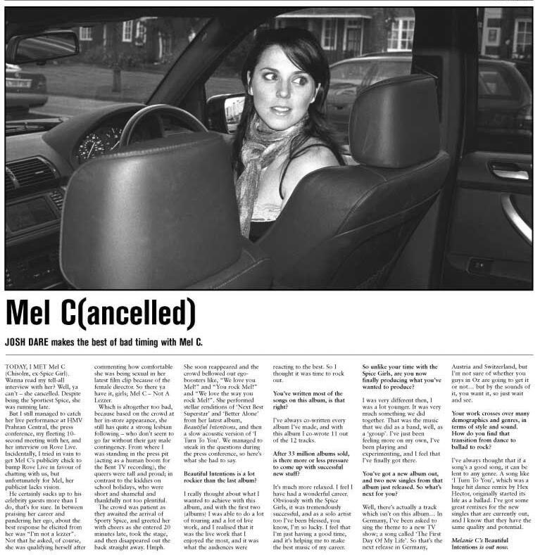 JOSH DARE makes the most of bad timing with Mel C.Today, I met Mel C (Chisolm, ex-Spice Girl). Wanna read my tell-all interview with her? Well, ya can’t – she cancelled. Being the Sportiest Spice in the world apparently won’t help you from ‘running’ late.So this article is based upon her live performance at HMV Prahran Central, the press junket, my fleeting 10-second meeting with her, and her interview on Rove Live that I just watched. Incidentally, I tried in vain to get Mel C’s publicity chick to bump Rove Live in favour of chatting with us, but unfortunately for Mel her publicist lacks vision. What’s Rove got that we don’t, huh? (Besides the national coverage, reputation and limitless charm?)He certainly sucks up to his celebrity guests more than I do, that’s for sure. In between praising her career and pandering her ego, about the best response he elicted from her was “I’m not a lezzer”. Not that he asked, of course, she was qualifying herself after commenting how comfortable she was being sexual in her latest film clip because it of the female director. So there ya have it, girls – Not A Lezzer.Which is altogether too bad, because based on the crowd at her in-store appearance, she still has quite a strong lesbian following – who don’t seem to go far without their gay male contingency. From where I was standing in the press pit (acting as a human boom for the Bent TV recording), the queers were tall and proud; in contrast with the kiddies on school holidays, who were short and shameful and thankfully not too plentiful.The crowd was patient as they awaited the arrival of Sporty Spice, and greeted her with cheers as she entered the shopping centre 20 minutes late, took the stage, and then disappeared out the back straight away. Hmph. She soon reappeared and the crowd bellowed out ego-boosters like, “We love you Mel!” and “You rock Mel!” and “We love the way you rock Mel!”. She performed stellar renditions of 'Next Best Superstar' and 'Better Alone' from her latest album, Beautiful Intentions, and then a slow acoustic version of 'I Turn To You'. We managed to sneak in the questions during the press junket, so here’s what she had to say.(So) Beautiful Intentions is a lot rockier than the last album?