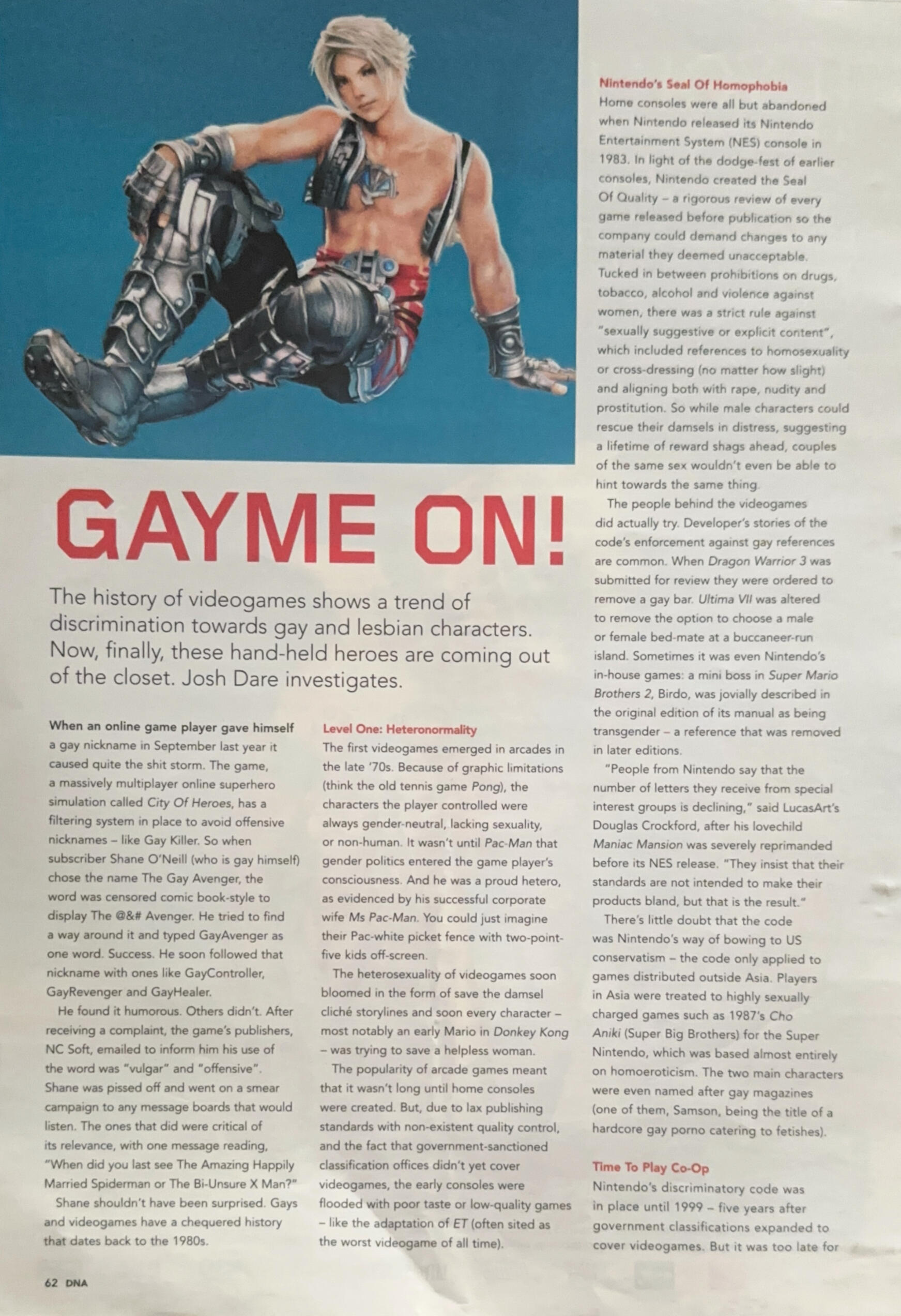 The history of video games shows a trend of discrimination towards gay and lesbiam characters. Now, finally, these hand-held heroes are coming out of the closet. Josh Dare investigates.Pull quote: “When did you last see ‘The Amazing Happily Married Spiderman’ or ‘The Bi-Unsure X Man’?”When an online game player gave himself a gay nickname in September last year, it caused quite the shit storm. The game, a massively multiplayer online superhero simulation called City of Heroes, has a filtering system in place to avoid offensive nicknames like ‘Gay Killer’. So when subscriber Shane O’Neill (who is gay himself) chose the name ‘The Gay Avenger’, the word was censored comic book style to display ‘The @&# Avenger’. He tried to find a way around it – and typed GayAvenger as one word. Success. He soon followed that up with GayController, GayRevenger and GayHealer.He found it “humorous”. Others didn’t. After receiving a complaint, the game’s publishers, NC Soft, emailed to inform him his use of the word was “vulgar” and “offensive”. Shane was pissed, and went on a smear campaign to any message boards that would listen. The ones that did were critical of its relevance, with one message reading, “When did you last see ‘The Amazing Happily Married Spiderman’ or ‘The Bi-Unsure X Man’?”Shane shouldn’t have been surprised. Gays and video games have a checkered history that dates all the way back to the 1980s.Level one: heteronormalityThe first video games emerged in arcades in the late 1970s. Because of graphic limitations (think Pong), the characters the player controlled were always gender-neutral, lacking sexuality; or non-human, like a mouse, space ship or race car. It wasn’t until Pac-Man that gender politics entered the game player’s consciousness – and he was a proud hetero, as evidenced by his also-successful corporate wife Ms. Pac-Man. You could just imagine their ‘Pac-White picket fence with two point five kids’ off-screen.The heterosexuality of video games soon bloomed in the form of the ‘save the damsel’ cliché storyline, and soon every video game character – most notably an early Mario in Donkey Kong – was trying to save a helpless woman.The popularity of arcade games meant that it wasn’t long until home consoles were created. But, due to lax publishing standards with non-existent quality control, and the fact that government-sanctioned classification offices (like Australia’s OFLC) didn’t yet cover video games, the early consoles were flooded with poor taste or low-quality games – like the adaptation of E.T., often quoted as the worst video game of all time.Nintendo’s Seal of HomophobiaHome consoles were all but abandoned when Nintendo released its NES console in 1983. In light of the dodgefest of earlier consoles, Nintendo created the “Seal of Quality” – a rigorous review that each and every game released for the system undertook before publication, so the company could demand changes to any material they deemed unacceptable.Tucked in between prohibitions on drugs, tobacco, alcohol and violence against women, there was a strict rule against “sexually suggestive or explicit content” – which included references to homosexuality or cross dressing (no matter how slight) and aligning both with rape, nudity and prostitution. So while male characters could rescue their damsels in distress, suggesting a lifetime of reward shags ahead, couples of the same sex wouldn’t even be able to hint towards the same thing.And the people behind the video games did actually try – developer’s stories of the code’s enforcement against gay references are common. When Dragon Warrior 3 was submitted for review, they were ordered to remove a gay bar. Ultima VII was altered to remove the option to choose a male or female ‘bedmate’ if you paid a fee at a buccaneer-run island. Sometimes it was even Nintendo’s in-house games: a mini boss in Super Mario Brothers 2, Birdo, was jovially described in the original edition of its manual as being transgender – a reference that was removed in later editions.“People from Nintendo say with pride that even though they are growing, the number of letters they receive from special interest groups is declining,” said LucasArt’s Douglas Crockford, after his lovechild Maniac Mansion was severely reprimanded before its NES release. “They insist that their standards are not intended to make their products bland, but that is the inevitable result.”There’s little doubt that the code was Nintendo’s way of bowing to US conservatism – the code only applied to games distributed outside Asia. Players in Asia were treated to highly sexually-charged games such as 1987’s Cho Aniki (“Super Big Brothers”) for the Super Nintendo, which was based almost entirely on homoeroticism. The two main characters were even named after gay magazines (one of them, ‘Samson’, being a title of hardcore gay porno magazine catering to fetishes for fat, old men).Time to play co-opNintendo’s discriminatory code was in place until 1999; five years after government classifications expanded to cover video games. But it was too late for Nintendo. While they had successfully cradled video games and their players through the industry’s formative years, tight restrictions on their content sent publishers and players alike to more liberal competitors like Sony and Microsoft – who then evolved video games to a bona fide home entertainment industry worth billions each year. But while the graphics may edge on lifelike, the contents certainly don’t.In a world full of superfluous gay characters on TV (like, oh I dunno, the whole cast of Queer Eye), video games are still void of controllable gay characters – though there is a certain degree of quiet integration that’s pretty sublime.One of the first games to incorporate gay elements was SquareSoft’s Final Fantasy VII, which is ofte